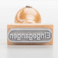 Bürostempel Holz mit Motiv EingegangenPreiswert: 35 x 15 mm (Typ HZ3515) ohne StempelkissenBitte legen Sie keine Druckdatei an.Das Erstellen der Druckdatei übernehmen wir für Sie als exklusiven Service.