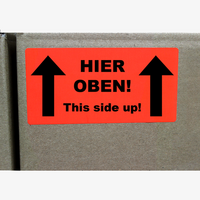 Hinweisetiketten HIER OBEN (10 x 5 cm)Pro Rolle: 1000 Stück/Etiketten1/0-farbig bedruckt (einseitig schwarz)Rotes, einseitig gestrichenes Leuchtfarbenpapier 76 g/m²Endformat: 10 x 5 cmRollendurchmesser: 3 Zoll (ca. 76 mm)Etiketten außenliegend auf Rolle, Fuß voraus, p...