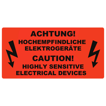 Hinweisetiketten HOCHEMPFINDLICHE ELEKTROGERÄTE (10 x 5 cm)Pro Rolle: 1000 Stück/Etiketten1/0-farbig bedruckt (einseitig schwarz)Rotes, einseitig gestrichenes Leuchtfarbenpapier 76 g/m²Endformat: 10 x 5 cmRollendurchmesser: 3 Zoll (ca. 76 mm)Etiketten außenliegend auf...