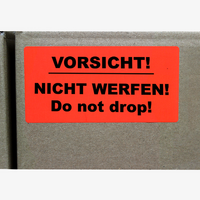 Hinweisetiketten NICHT WERFEN (10 x 5 cm)Pro Rolle: 1000 Stück/Etiketten1/0-farbig bedruckt (einseitig schwarz)Rotes, einseitig gestrichenes Leuchtfarbenpapier 76 g/m²Endformat: 10 x 5 cmRollendurchmesser: 3 Zoll (ca. 76 mm)Etiketten außenliegend auf Rolle, Fuß voraus...