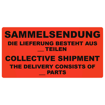 Hinweisetiketten SAMMELSENDUNG (10 x 5 cm)Pro Rolle: 1000 Stück/Etiketten1/0-farbig bedruckt (einseitig schwarz)Rotes, einseitig gestrichenes Leuchtfarbenpapier 76 g/m²Endformat: 10 x 5 cmRollendurchmesser: 3 Zoll (ca. 76 mm)Etiketten außenliegend auf Rolle, Fuß vorau...