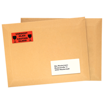 Hinweisetiketten VORSICHT GLAS (5,08 x 2,54 cm)Pro Rolle: 1000 Stück/Etiketten1/0-farbig bedruckt (einseitig schwarz)Rotes, einseitig gestrichenes Leuchtfarbenpapier 76 g/m²Endformat: 5,08 x 2,54 cmRollendurchmesser: 3 Zoll (ca. 76 mm)Etiketten außenliegend auf Rolle,...