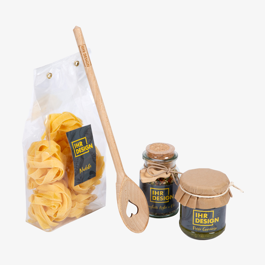 Sie suchen ein geschmackvolles Geschenk, das Sie ganzjährig verschenken können? Hierfür legen wir Ihnen die Pasta-Präsentbox ans Herz. Diese enthält Nudeln, Pesto Genovese, eine exklusive Gewürzmischung für Spaghetti all' olio und einen dekorativen Kochlöffel. Ein wahrer kulinarischer Genuss für alle, die gutes Essen lieben! Die Spezialitäten in allen Geschenkboxen stammen von unserem Partner Gourmet Berner.